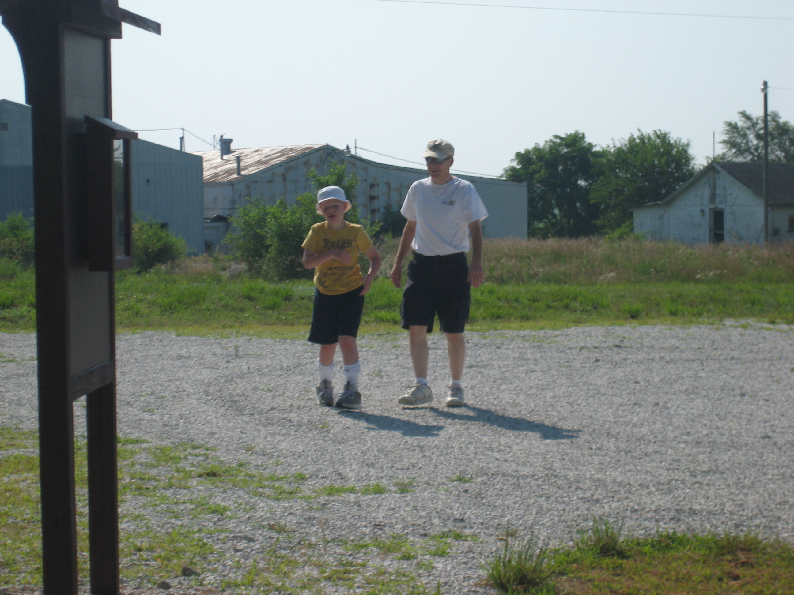 Dan and Samuel "hiking" in the parking area.